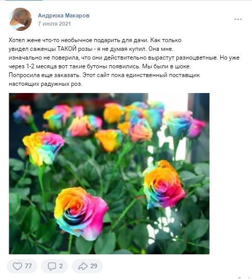 Подробную технологию создания саженцев мы держим в секрете. Но, в общем, могу сказать, что это очень хрупкая и сложная работа. Нужно каждый стебель правильно разрезать, ввести туда специальный краситель и подождать. Мы с коллегами экспериментировали 4 года, чтобы создать идеальные саженцы радужной розы. И теперь мы даем уникальную возможность каждому выращивать такие необычные розы, которые станут настоящим украшением для сада!
