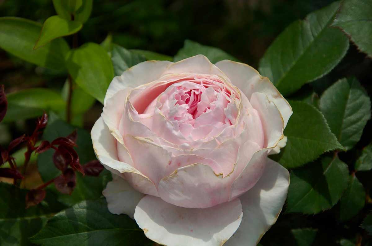 Его цветы настолько похожи на пион, что иногда только характерная форма ярко зеленых листьев помогает отличить сорт розы «Peony Magic» от других растений.