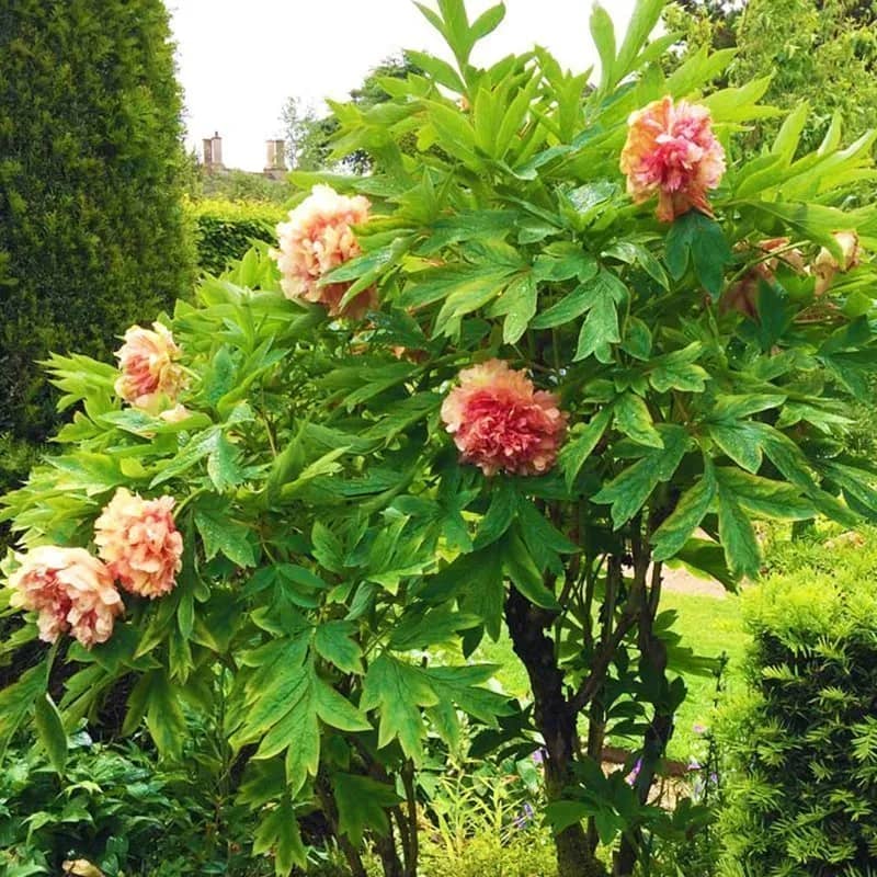 Любой опытный цветовод сразу узнает Пион Kinkaku Jin Ge древовидный. Высота его куста нередко достигает полутора метров. Огромные розово-красные цветы с желтыми краями напоминают летний закат солнца. Глядя на куст издалека, его легко перепутать с апельсиновым деревом. Цветение обильное в конце сезона. Особенностью данного растения является его долгожительство. Оно зимостойко, неприхотливо и устойчиво к болезням. На своей родине в Китае, произрастая в диком виде, пионы легко переносят холодные снежные зимы, потому наш климат для них является вполне комфортным.Цветок, который в диаметре может достигать 25-30 см, благоухает пикантным лимонным ароматом. Высаживают это растение либо под открытым небом, где доступ солнца не ограничен, либо в полутени.